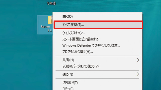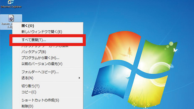 3.デスクトップに、ダウンロードしたzipファイルが保存されます。保存されたzipファイルのアイコンの上で、マウスの右ボタンを押すと、メニューが表示されますので、その中から「すべてを展開(T)...」をクリックしてください。