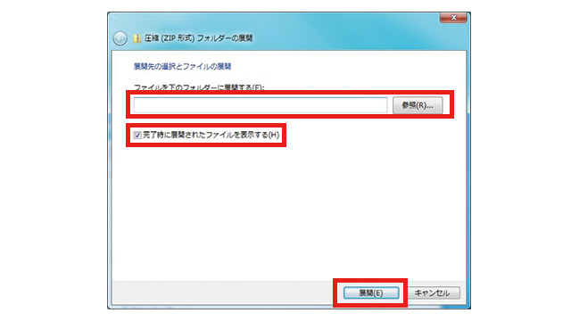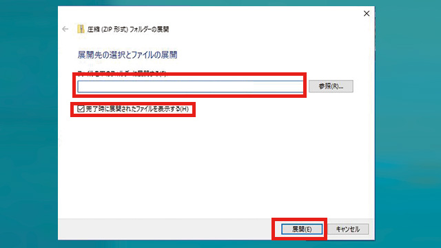 4.「圧縮(ZIP形式)フォルダーの展開」ウィンドウが表示されます。「ファイルを下のフォルダーに展開する(F):」欄に、解凍先を指定し、「完了時に展開されたファイルを表示する(H)」にチェックをいれます。入力が済んだら、右下の「展開(E)」ボタンをクリックします。