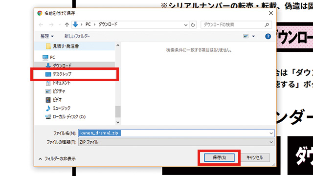 2.「名前をつけて保存」ウィンドウが表示されます。左メニューより「デスクトップ」を選択して、右下の「保存(S)」ボタンをクリックしてください。