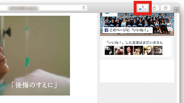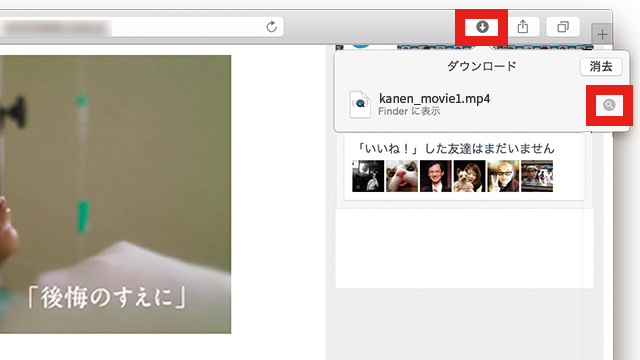 4.右上の下矢印マークをクリックすると、ダウンロード履歴が表示されます。履歴の右側に表示されている虫眼鏡マークをクリックすると、動画の保存先フォルダを表示することもできます。