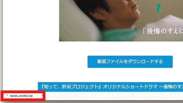 3.ブラウザのウィンドウ下に、ダウンロードしたファイル名が表示されます。クリックするとzipファイルの解凍が始まります。