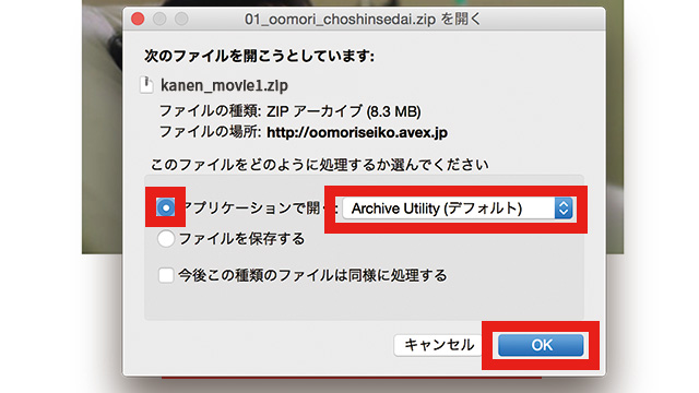 2.ウィンドウが表示され、どのような処理をするか求められます。「アプリケーションで開く」の先頭丸印をクリックし、右側のセレクトボックスより、「Archive Utility(デフォルト)」を選択してください。最後にウィンドウ右下の「OK」ボタンを押してください。