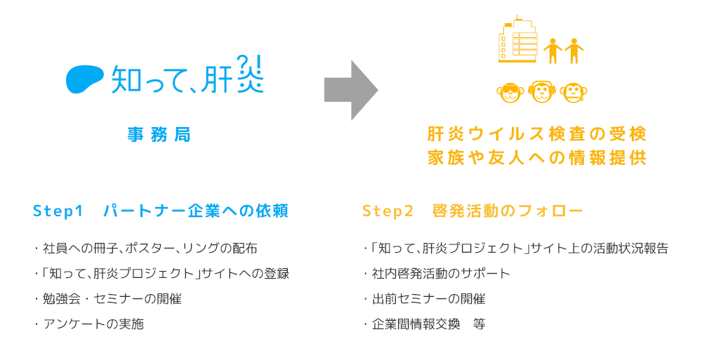 パートナー企業等が、プロジェクトの趣旨に賛同して、社内又は社外活動の内容に応じた肝炎対策を行うことで、企業等における肝炎の克服に向けた取り組みを進めることを目的とする。