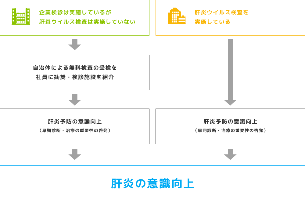 肝炎ウイルス検査の受検に関する従業員等への呼びかけ、ポスターの掲示、チラシの配付、等。肝炎ウイルス検査の職域健診での実施等