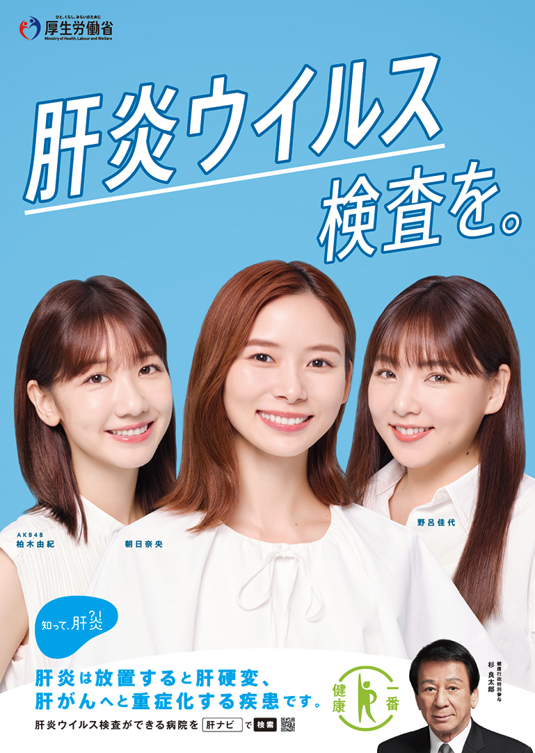 動画には肝炎対策特別大使の伍代夏子氏、肝炎対策広報大使の徳光和夫氏、スペシャルサポーターの瀬川瑛子氏、コロッケ氏の4名が出演され、4種類の啓発動画が完成しました。また、啓発用のポスターにもスペシャルサポーターの朝日奈央氏、野呂佳代氏、柏木由紀氏(AKB48)の3名が出演し、「肝炎ウイルス検査を。」篇が公開となりました。