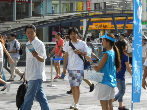 ステージを見られない方にも、肝炎についての正しい知識と検査推進を実現するために、「肝炎啓発セット」の配布も同時に実施いたしました。大型百貨店前ということもあり、多くの方にイベント会場周辺に集まっていただくことができ、キットの受取率も予想を上回る好反響でした。ご高齢層から普段あまり関心の薄い若年層の皆様にも興味を持っていただけ、キットを受け取ったあとにパネル展示をご覧になられる姿もお見受けいたしました。ご協力いただきました多くの皆様のおかげで大成功を収めることができました。この場をお借り致しまして心より感謝申し上げます。