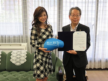 厚生労働省の「知って、肝炎プロジェクト」のスペシャルサポーターを務める歌手の島谷ひとみさん(広島県呉市出身)が故郷を表敬訪問し、健康診断などの機会を通じた肝炎ウイルス検査の受検を呼び掛けました。