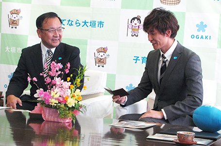 厚生労働省「知って、肝炎プロジェクト」のスペシャルサポーターを務める橘慶太さんが大垣市を表敬訪問し、小川市長に肝炎の早期発見・早期治療の推進への協力を訴えました。