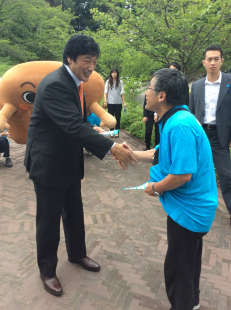 小橋さんは、肝炎の早期発見・早期治療について、武雄市に更なる協力を求める旨が述べられました。続いて、武雄市の小松政(こまつただし)市長から「佐賀県は10万人あたりの肝がんでの死亡率が13年連続でワースト1位です。そのため佐賀県では、県をあげて、肝炎対策を行っています。小橋さんが来て下さり、本当に力強い後押しを頂けたと思っております。 」と感謝の言葉が述べられました。