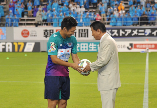 試合前のセレモニーに杉特別参与とw-inds.氏が登場するとスタジアムに集まった1万人と観客から大きな拍手と歓声があがりました。