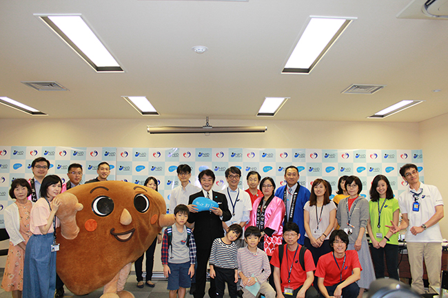 当日は、国立感染症研究所 所長の脇田隆字氏と日本で唯一の臓器のゆるキャラ「肝ちゃん」の3名でイベントを進行しました。 田辺氏は「私自身もスペシャルサポーターに就任するまで意識が低く、肝炎について何も知識がありませんでしたが、 実際にスペシャルサポーターになって初めて検査を受けました。私が会長を務める日本歌手協会の中にも、 過去、肝炎の方がいらっしゃいました。ぜひ皆さん検査を受けましょう」と話し、参加者に向けて検査の必要性を促しました。