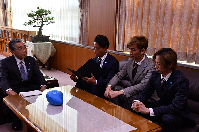 この度、厚生労働省 肝炎対策国民運動「知って、肝炎プロジェクト」は、スペシャルサポーター w-inds. 橘 慶太氏、千葉 涼平氏、緒方 龍一氏が10月15日(月)に島根県を表敬訪問し肝炎に関する啓発活動を行いました。