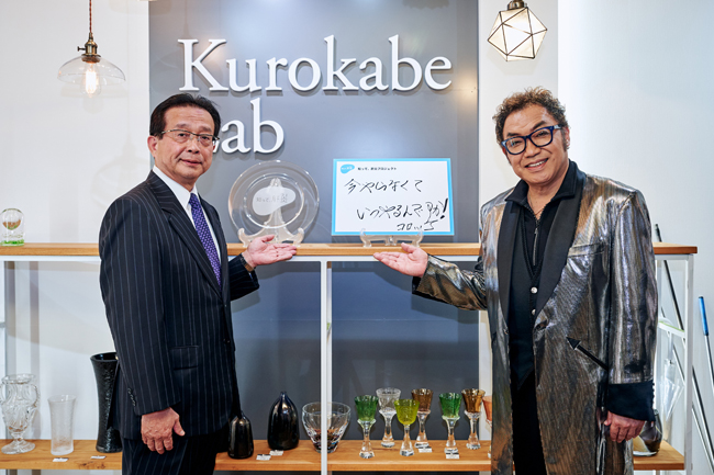 表敬訪問は、長浜市の観光名所である黒壁スクエアの「黒壁ガラススタジオ」で行われました。黒壁スクエアは、ガラス工芸として有名なことから、知って、肝炎プロジェクトのロゴ入り記念プレートが披露された他、会場の担当者より黒壁スクエアの歴史と文化について紹介があり、コロッケ氏ら出演者は興味深げに耳を傾けていました。