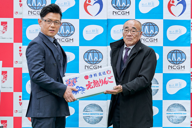 的場 浩司 氏は、今回青森県に足を運んだ理由は、青森県が今年度の“集中広報県”であるからと説明し、青森の皆さんへ「青森県は全国の中で、肝がんと全がんの死亡率が高い県です。その中の“肝がん”の原因の一つが、肝炎という病気です。肝炎は肝臓の細胞が破壊している状態です。肝炎は沈黙の臓器とも言われており、病状が進むまで症状に気づかないことがあります。知らない間に病状が進行すると、肝硬変という肝臓が硬くなる病気や、更に進行すると肝がんになってしまいます。肝硬変や肝がんになってからでは、治療が難しいのです。」と、肝炎という病気が命を脅かす病気へと進行してしまう可能性や、早期発見・早期治療の大切さを訴えました。