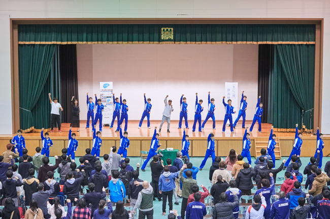 知って、肝炎プロジェクトのテーマソング「笑顔の明日(あした)」に合わせて作られた「知って、肝炎ダンス」を、青森大学男子新体操部の皆さんや、会場に集まった約200人の在学生・先生方と一緒に踊りました。