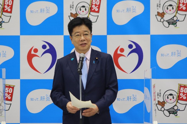 冒頭には、加藤勝信厚生労働大臣が「肝臓は沈黙の臓器と言われており、肝炎ウイルスに感染しても自覚症状がないまま進行し、治療を開始するタイミングが遅れるケースもあります。現在、日本では、年間約3万人の方が肝臓がんで亡くなっています。肝炎を身近な問題として受け止めて、少なくとも一生に一回は、肝炎ウイルス検査を受けていただけるよう、普及啓発を推進していただいている、非常に重要な取組です。」と挨拶。「知って、肝炎プロジェクト」による肝炎対策のより一層の普及啓発に期待を寄せられました。