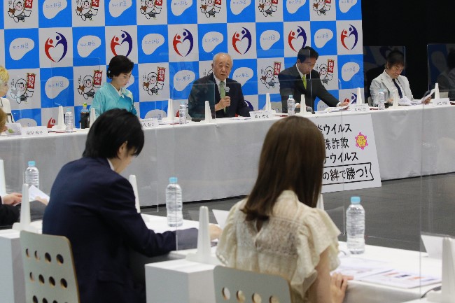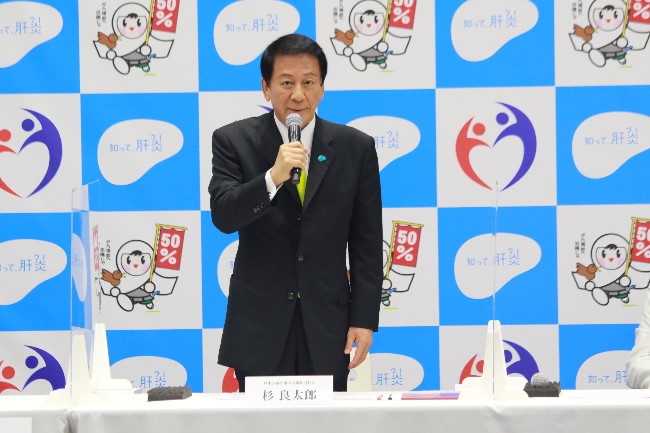 杉良太郎特別参与は「今年で肝炎対策に携わって9年。5年前からは集中広報県を指定し、大使やスペシャルサポーターを派遣して積極的な肝炎の啓発活動を行い、その成果も現れてきています。今年は和歌山県です。新型コロナウイルスの流行で活動が制限されてきましたが、先日やっと訪問することができました。ぜひとも今年は和歌山県で成果をあげたいと思います。また肝炎だけではなく、がん対策などについても早期発見・早期治療の大切さを啓発していきたい」と述べられました。