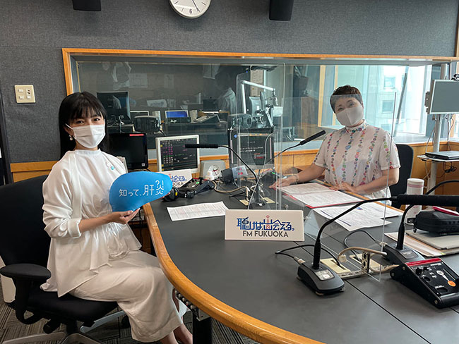 7月28日(水)の世界・日本肝炎デーを含む7月26日(月)~8月1日(日)の肝臓週間に合わせて集中広報啓発活動を実施しました。そのなかで、今年の集中広報県の1つである福岡県にて「知って、肝炎プロジェクト」スペシャルサポーターの島谷ひとみ氏が、福岡放送の「バリはやッ!ZIP!」、FM福岡の「ラジオカー」中継コーナーに出演し、福岡県民に向けて肝炎の啓発活動を行いました。