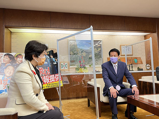 11月2日(火)に、杉良太郎健康行政特別参与が山形県を表敬訪問し、山形県知事の吉村美栄子氏らとともに、同県の肝炎対策について懇談を行いました。懇談のなかで、杉特別参与は全国の肝炎に対する意識について、「自分は大丈夫だと思わず、肝炎が発症する前に検査に行ってほしい。」と述べられました。