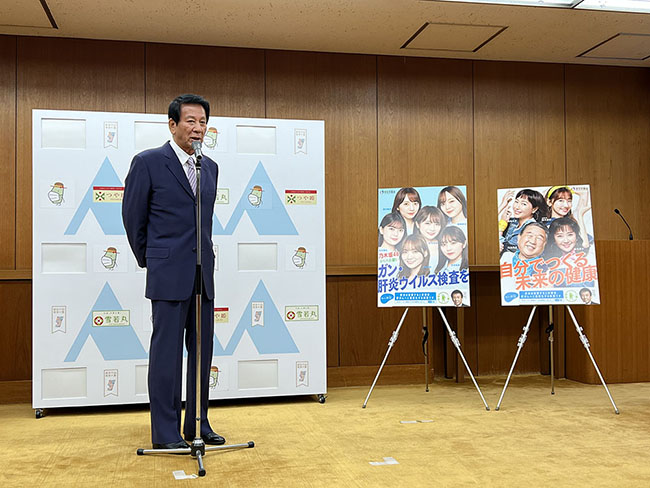 この日、知って、肝炎プロジェクトの2021年度新ポスターが初めて披露されました。杉特別参与は、「1枚目は乃木坂46のメンバーを起用し、若い人にも肝炎に関心を持ってもらいたいという意図で作成した。2枚目はHIPHOPダンスを踊るような衣装を着て賑やかな雰囲気を出し、ダンスなどの楽しい運動で健康になることをアピールしている。」と2種類のポスターを紹介しました。