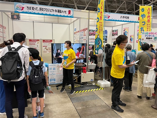 6月12日(日)に千葉県の幕張メッセで開催された『県民の日ちばワクワクフェスタ2022』にて「知って、肝炎プロジェクト」のブースを出展しました。今回のイベントでは千葉大学医学部附属病院のみなさんにご協力いただき、肝臓の硬さや、肝臓の脂肪量をチェックできる検査スペースを設けることで、沢山の方々に自身の肝臓に対して関心をもっていただきました。初めてこのような検査を受けた方も多く、「簡単に受けられて良かった。肝臓についてきちんと考えないといけないと感じた。」という声もあり、是非、今後は肝炎ウイルス検査も受けていただくように呼びかけをしました。