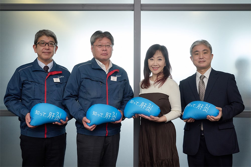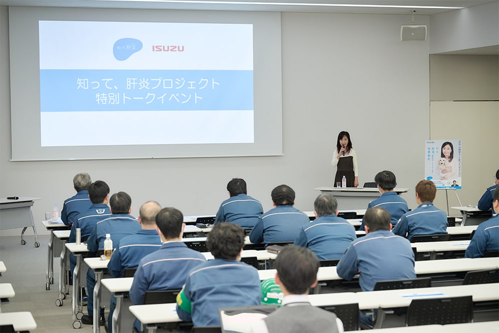 11月29日(水)に、「知って、肝炎プロジェクト」肝炎対策特別大使を務める伍代夏子氏が自動車メーカーいすゞ自動車株式会社の藤沢工場を訪問し、“ウイルス性肝炎”をテーマに、役員との対談や、従業員の皆さんに向けたトークイベントを実施しました。