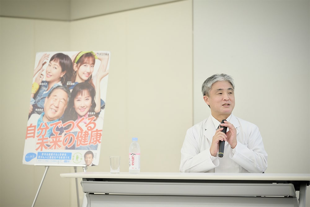 同席した米田先生は、ウイルス性肝炎について「肝炎ウイルスは肝臓の中で肝障害を起こすウイルスで、B型肝炎やC型肝炎は感染した後に適切な治療をしないと体の中に残ってしまいます。慢性的に肝臓にダメージを与えますが、その症状は現れにくいことが特徴です。」と話し、続けて伍代氏は、「自覚症状が出にくいことから、肝臓は“沈黙の臓器”と言われているんです。症状が現れた頃には手遅れになってしまいかねないので、いすゞ自動車の皆さんにも是非、肝炎ウイルス検査を一度受けていただきたいです。」と話しました。