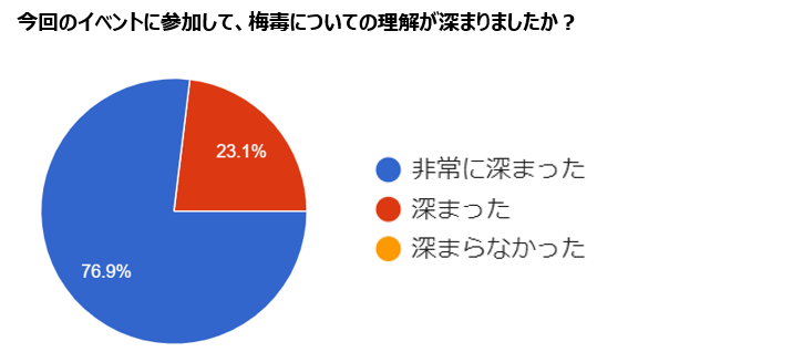 また、イベントを終えた感想として「多くの割合で風俗とは関係ない経路で感染者が増えているということは、つまり、自分に起きててもおかしくない話」と述べられ、「自分を守るため、大切な人を守るため、自分が出来ることから勇気を出すこと。大きいことが出来なくてもいい、小さいことから確実に。本当に心から自分を愛すること。今日からもっと健康に気をつけて、自分を大切にしませんか?」とお話をされました。