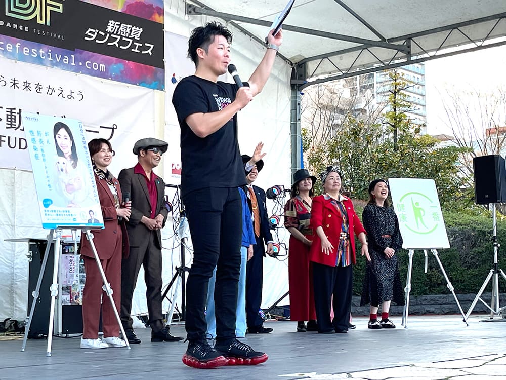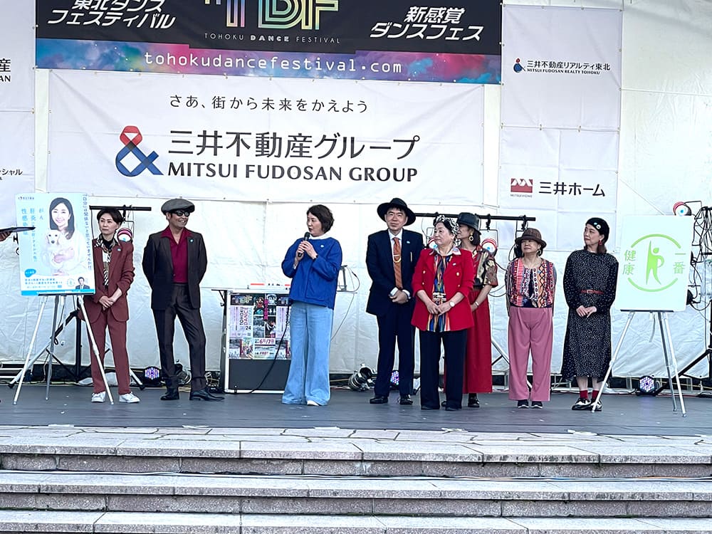 4月7日(日)に東北ダンスフェスティバル2024 × 「知って、肝炎」「健康一番」プロジェクト特別プログラム with feel the goodが、宮城県仙台市の勾当台公園市民広場で開催されました。J-pop Dance Sendai所属の、GOLD世代ダンスチームfeel the goodの皆様にご協力いただき、ダンスを行った後ステージ上で、肝炎をはじめとする病気の早期発見・早期治療の大切さ、そして心身ともに元気に生きるための健康づくりについて発信しました。