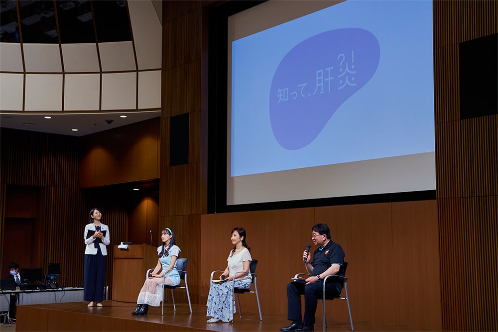 7月28日(日)に、肝炎対策特別大使である伍代夏子氏、スペシャルサポーターのSTU48 福田朱里氏が香川県肝炎デー 市民公開講座に出演し、香川県立中央病院の高口院長と一緒にトークショーを行いました。