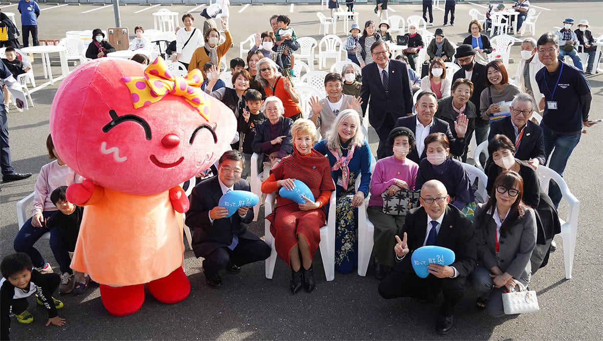 最後に肝臓の正しい知識を広める活動をしているマスコットキャラクターの「肝美ちゃん」が登場し、観客の皆さんと写真撮影を行いました。「肝美ちゃん」は肝臓を笑顔で元気にしていこうと活動をしており、佐賀県ではこの日が初めての登場となります。フォトセッションが終わるとそのまま瀬川氏はひとりひとりのところに足を運び、「健康には一緒に気をつけていきましょうね」と呼びかけていきました。観客の中には患者の皆様もいて、ひとりひとりに合わせた声掛けをしていきました。そこには人のことを思いやって話しかける瀬川氏と、その思いに心が動かされどんどん良い表情になっている皆さんの姿があって、とてもすばらしい光景が広がっていました。