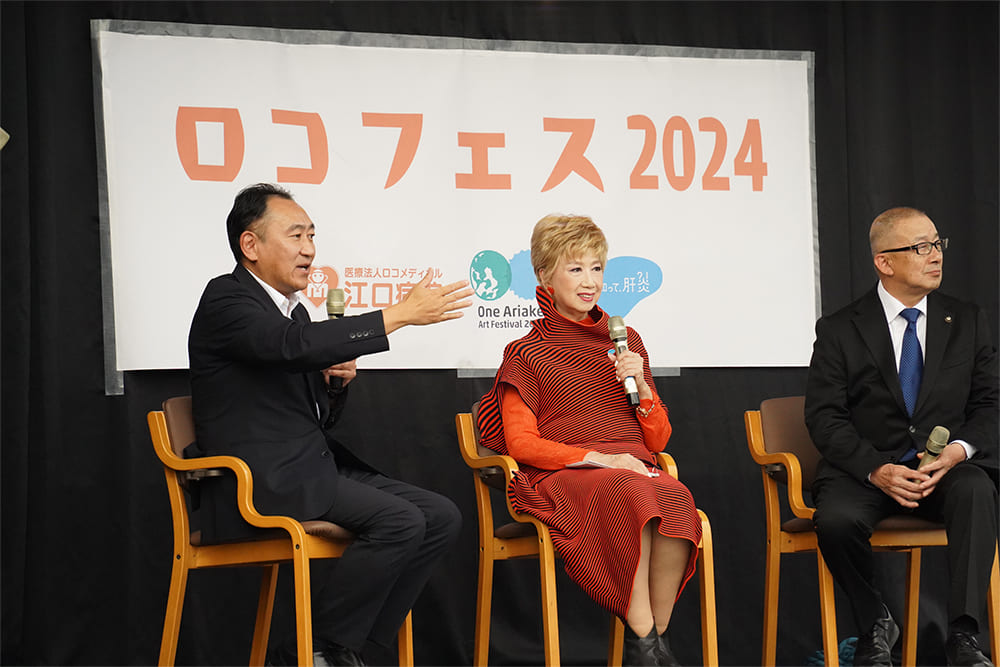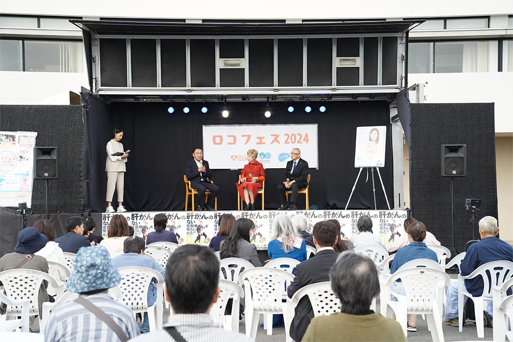 トークイベントでは瀬川 瑛子氏の他に、江里口小城市長と、江口病院の江口ゆういちろう先生が登壇し、3名で肝炎のクロストークが行われました。4年前まで佐賀県は肝がんの死亡率が全国ワースト1位でしたが、その状況を何とか打開しようと立ち上がったのが、江口先生をはじめとする佐賀大学の肝疾患センターの皆さんです。江口先生はその当時のことを振り返り、「2012年に佐賀大学の肝疾患センターで佐賀県の肝がんを減らそうというプロジェクトを立ち上げ、私はそこで責任者を務めていました。佐賀県と厚生労働省の「知って、肝炎プロジェクト」は、その当時から連携しています。CMを始め様々な啓発を行い、市と町の皆さんの協力を得て肝臓病の恐ろしさを住民の方に知っていただき、多くの方に検査を受けていただきました。当時は日本でもっとも多くの方に肝炎ウイルス検査を受けていただき、検査が進んだ県となりました。検査のおかげで肝臓病が早期に見つかり、そして多くの方が完治し、佐賀県は肝がんの死亡率が全国ワースト1位ではなくなりました。今はワースト10位以内にも入っていない状況です」と話し、肝炎ウイルス検査を受けることの重要性と、市や町全体が協力していくことの大切さを伝えました。その話を受けて瀬川氏は、「医療関係者と町の皆さんが力を合わせて一丸となって取り組まれていて、それは本当にすばらしいことだと思います。私も肝炎ウイルス検査は受けましたが、皆さんにもまだまだ元気なうちに予防の一環としても肝炎ウイルス検査を受けに行っていただき、自分の体の状態を知っていただきたいです」と述べました。肝炎ウイルス検査で早期に発見をして治療をすれば助かる命がたくさんあること、病院や市、町が協力をして県全体で取り組むことの大切さを、佐賀県は先導に立って示してくれました。