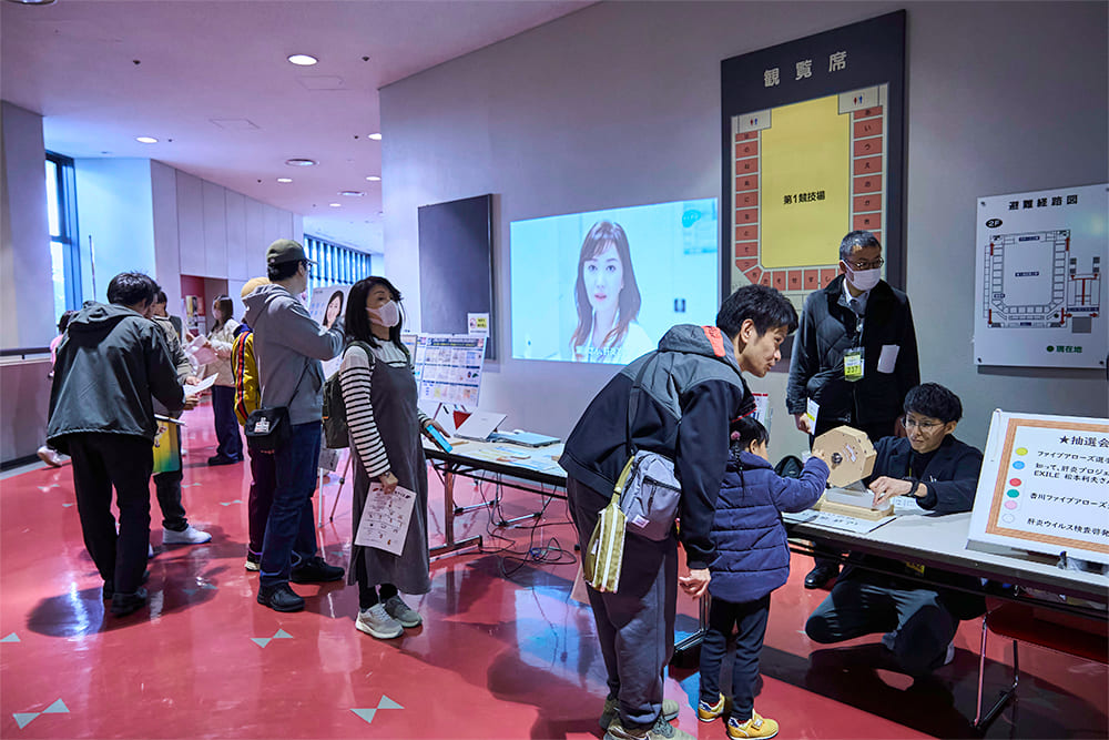 今回、会場内に「知って、肝炎プロジェクト」ブースを設置し、肝炎クイズとアンケートに答えると松本氏や香川ファイブアローズの選手の直筆サイン入りの景品が抽選で当たるキャンペーンを実施しました。
