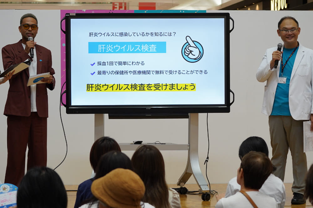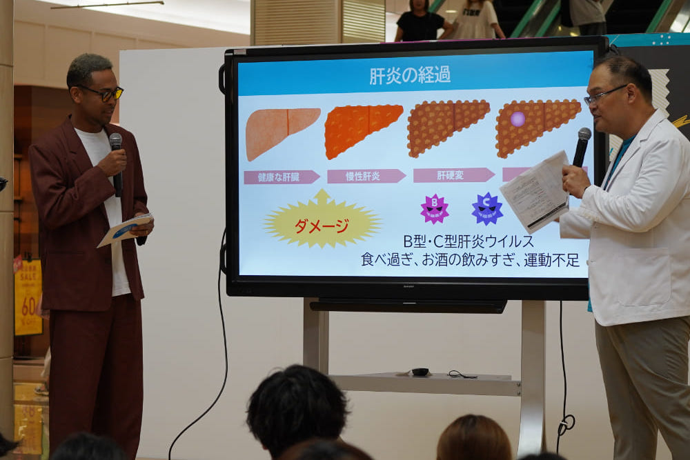 磯田氏は肝炎がどのような病気であるかをわかりやすく説明した上で、「近年では、ウイルス性だけではなく過度な飲酒や食べ過ぎなど、生活習慣が原因の肝炎が大きな問題となっています。」と述べました。肝炎ウイルスに感染していると知らずに過ごしている人も多いという話を受けたEXILE NESMITH氏は、「肝臓は“沈黙の臓器”と言われており、自覚症状がないまま病気が進行することがあります。放置すると肝がんなど命にかかわる病気につながることもあるので注意が必要です。」と肝炎ウイルス検査の重要性を伝えました。会場では無料の肝炎ウイルス検査が実施されており、 「ぜひ、この機会に検査を受けてください、まずは“知ること”がとても大切です!」と呼びかけました。