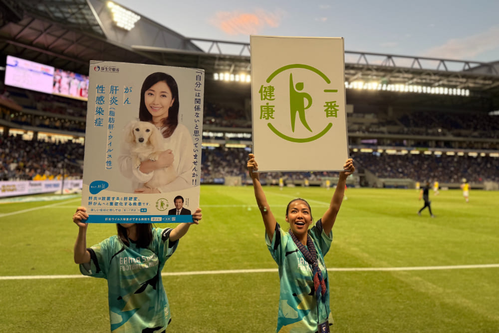 2025年9月27日(土)、大阪府のパナソニックスタジアム吹田にて開催されたJリーグ「ガンバ大阪 vs アルビレックス新潟」の試合に健康一番プロジェクトサポーターのMaasa氏が出演し、来場者に向けて「健康の大切さ」を呼びかけるイベントを実施しました。