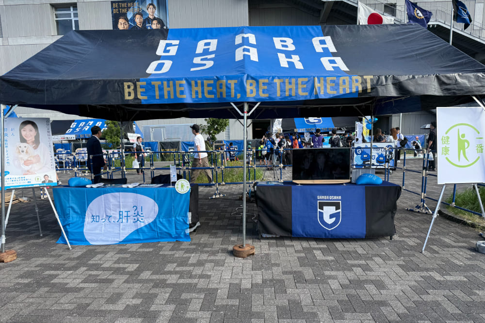 この日はステージイベントに加え、スタジアム入口付近にて健康啓発ブースを設置。チラシ配布や動画上映を通じて、来場者への情報発信を行いました。