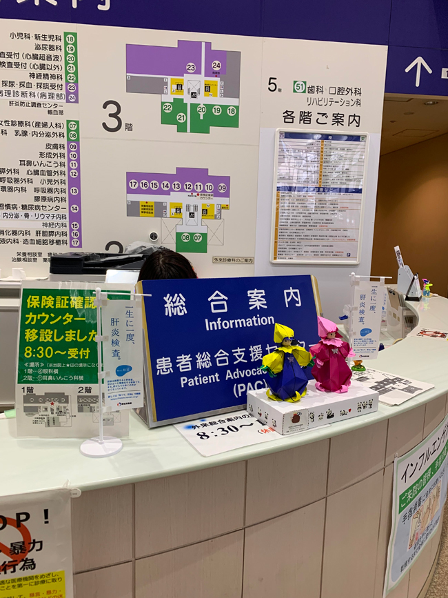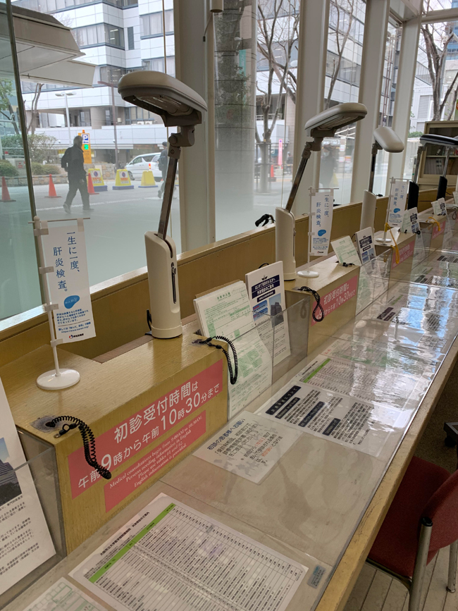 (総合案内、初診申込み用紙記載台、肝疾患関係チラシ設置棚、消化器内科・肝胆膵内科外来受付